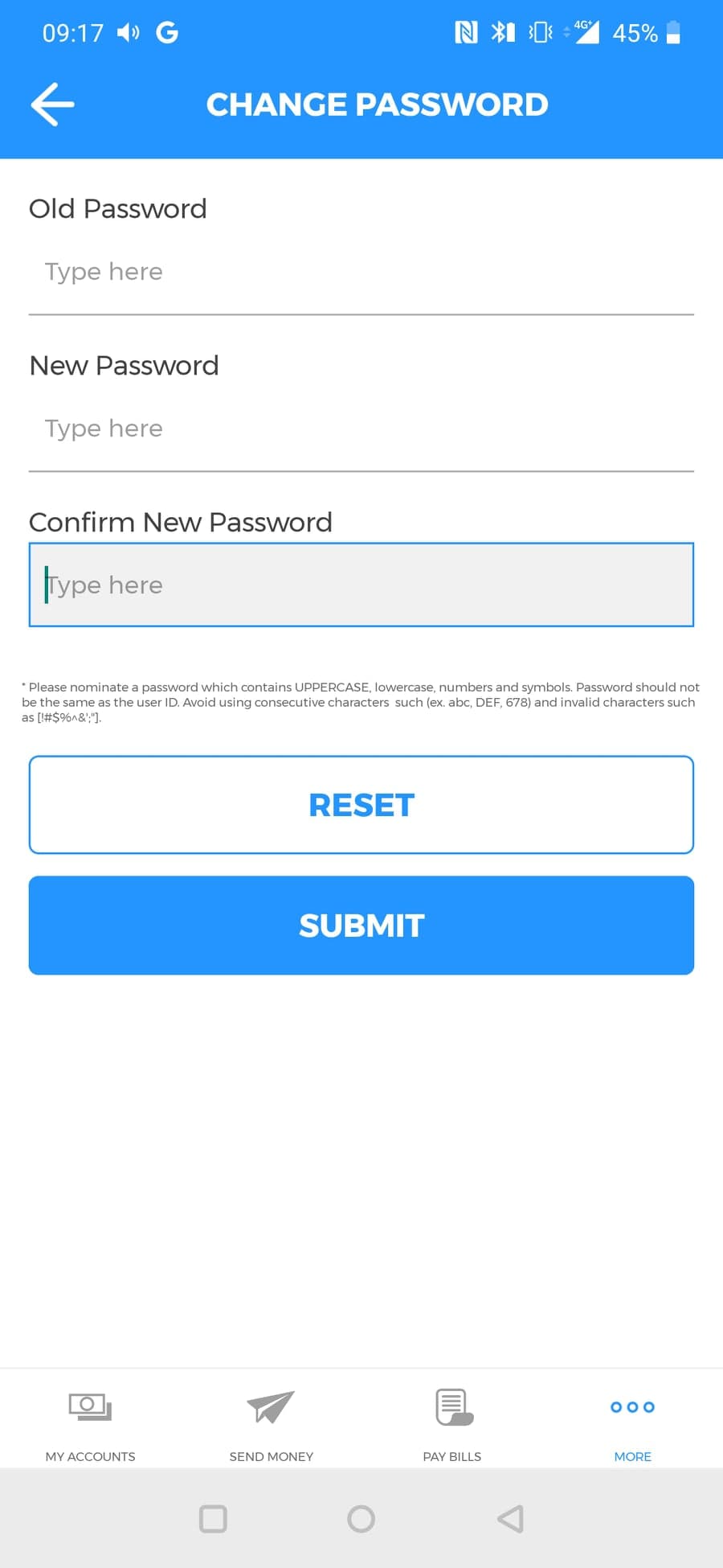 Please nominate a password which contains UPPERCASE, lowercase, numbers and symbols. Password should not be the same as the user ID. Avoid using consecutive characters such (ex. abc, DEF, 678) and invalid characters such as [!#$%^&';"].