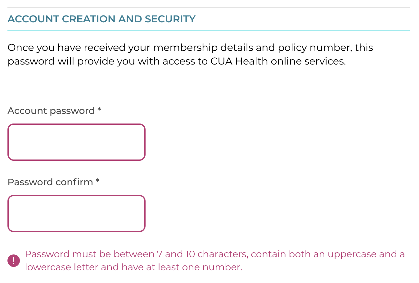 Credit Union Australia (CUA) Health dumb password rule screenshot