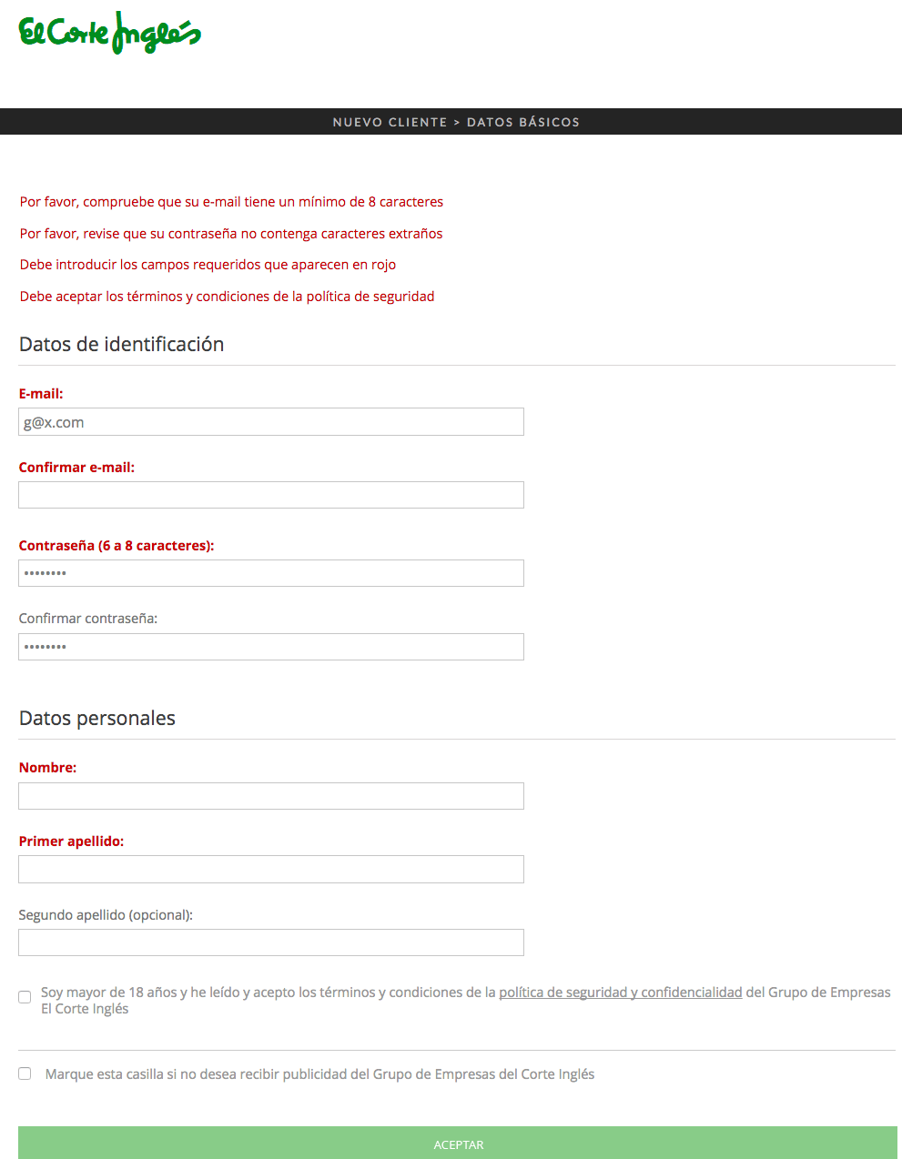 Min 6 and max 8 characters for password! Can't contain anything different than letters and numbers. Apart, the email address must have at least 8 characters (sorry million dollar domain owners! :D)