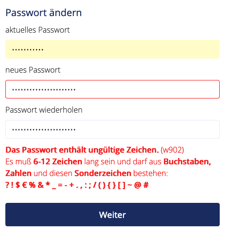 The new password can only have 6-12 characters. It may contain letters, numbers and a fixed set of special characters.