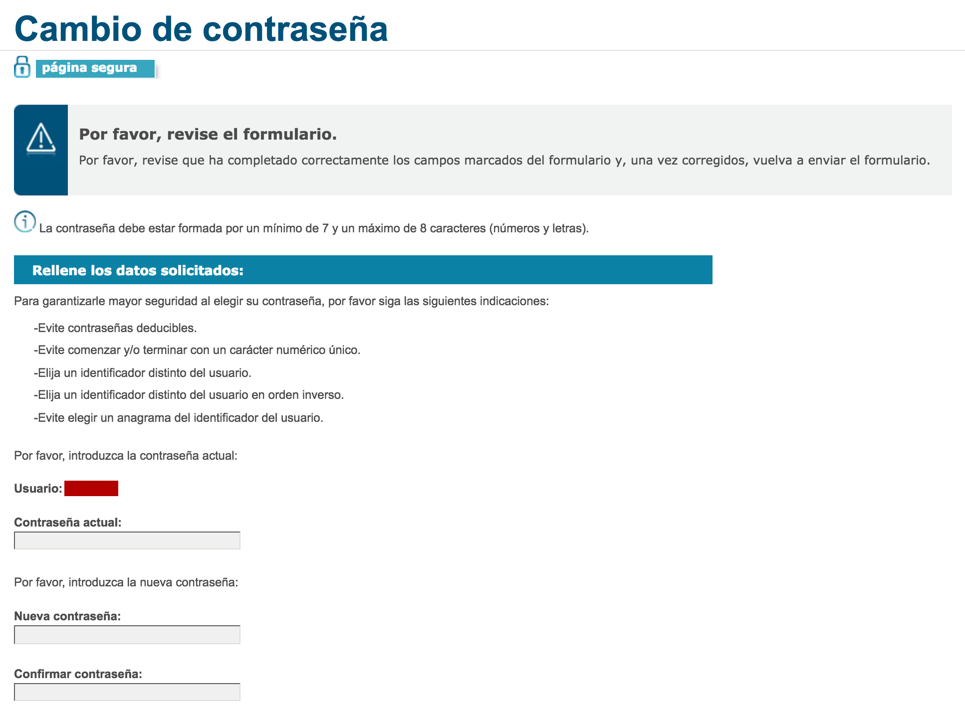 Min 7 and max 8 characters for password! Also to be different than the username: the user name is automatically generated and is based on the surname of the user with some characters replaced by digits :) Has been that way for more than 10 years.