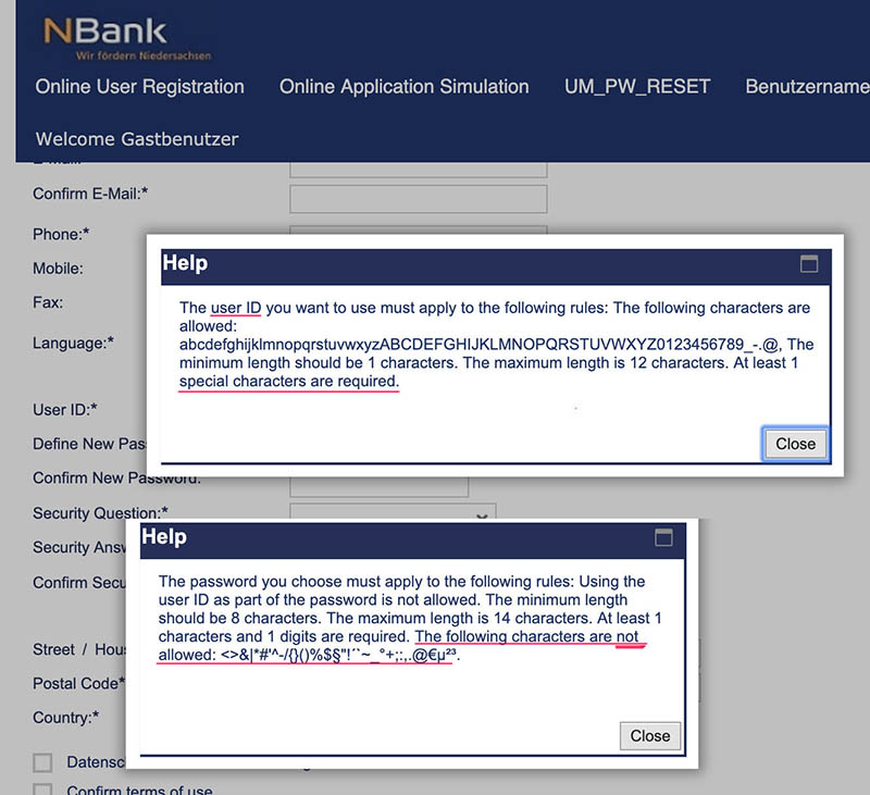 User ID has to contain special characters, password may not contain (basically) any special characters.