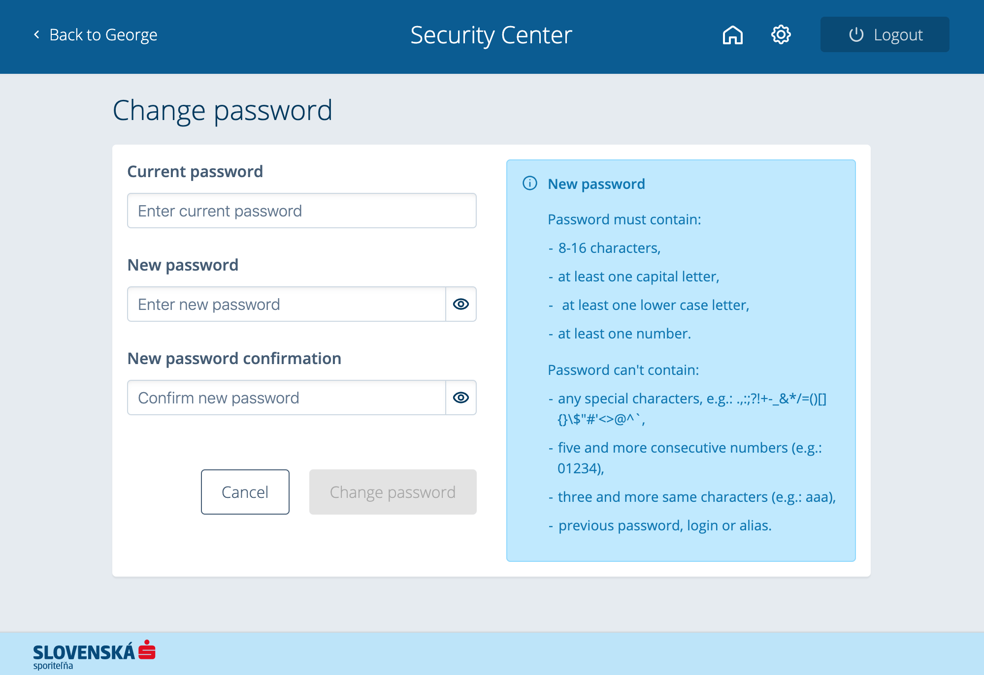 Slovenska sporitelna is the biggest bank in Slovakia. Despite pretty new version of the internet banking (rolled out in 2018), their password policy restricts password to be 16 characters long at most and prohibits any special characters.