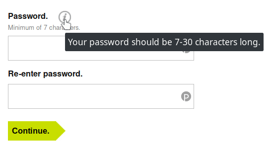 Password must be at least 7 characters long. The maximum length is inconsistent, however: when changing password, the maximum length is 30, but when resetting password via email link, the maximum length is 12.
