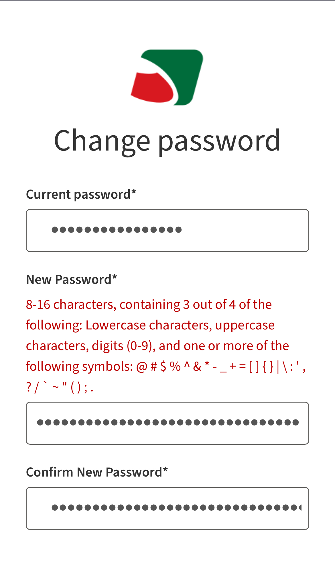 • Must contain 3 out of 4 of the following: lowercase characters, uppercase character, digits (0-9), and one or more of the following symbols: @#$%^&*-_+=[]{}|:',?/`~“();.