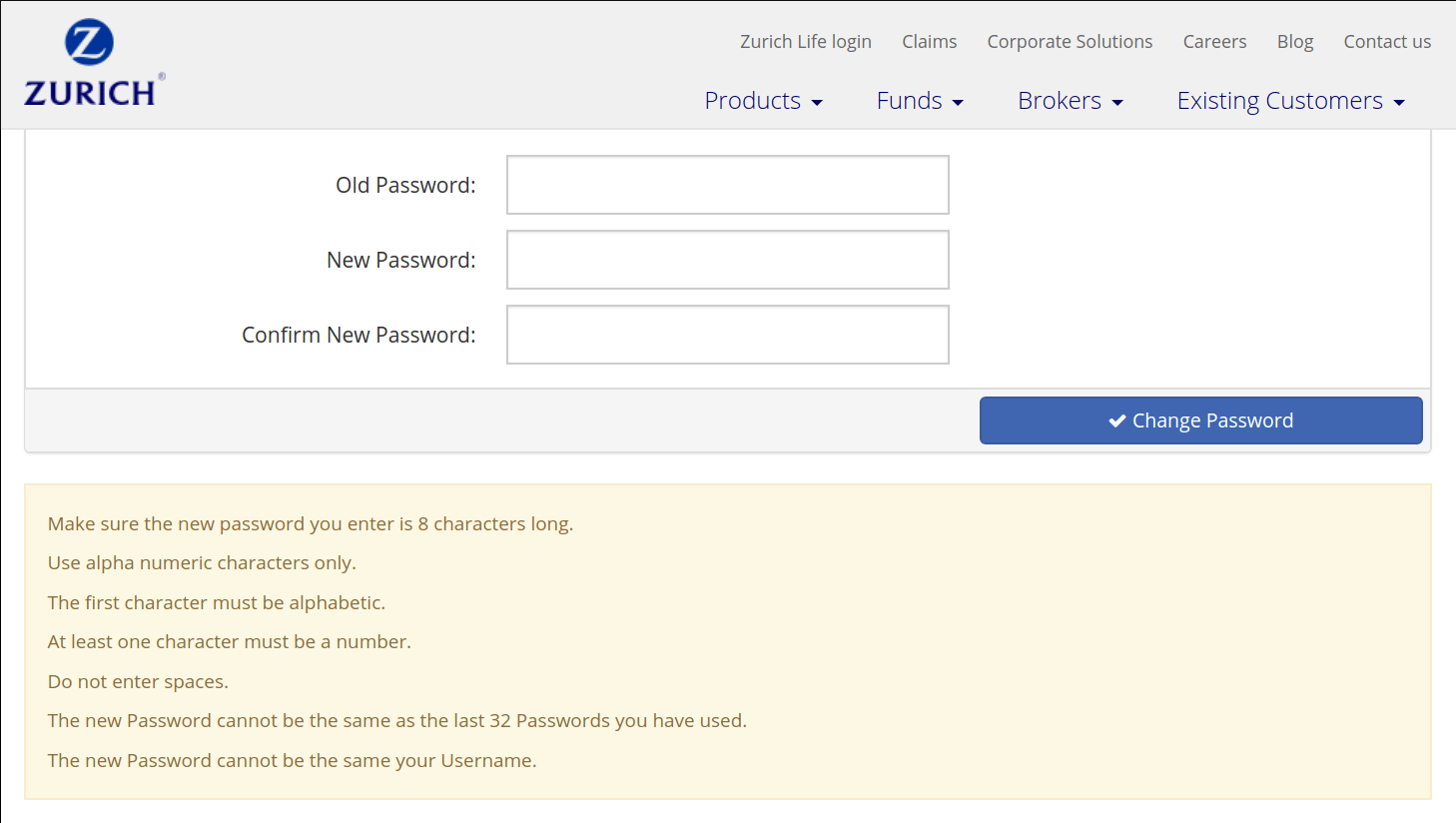Zurich dumb password rule screenshot